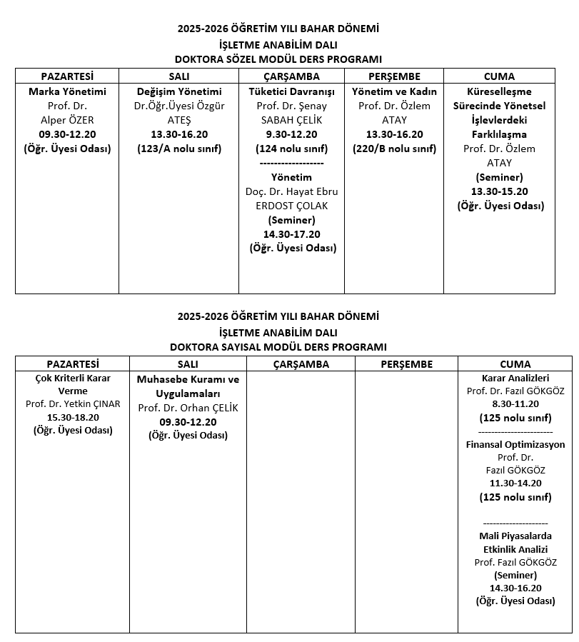 İşletme Bölümü Doktora 2025-2026 Bahar Dönemi Ders Programı