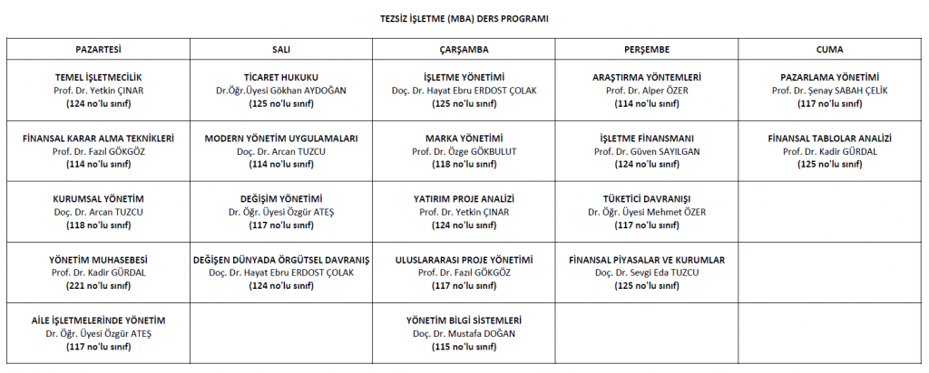 İşletme Bölümü Tezsiz Yüksek Lisans 2025-2026 Bahar Dönemi Ders Programı